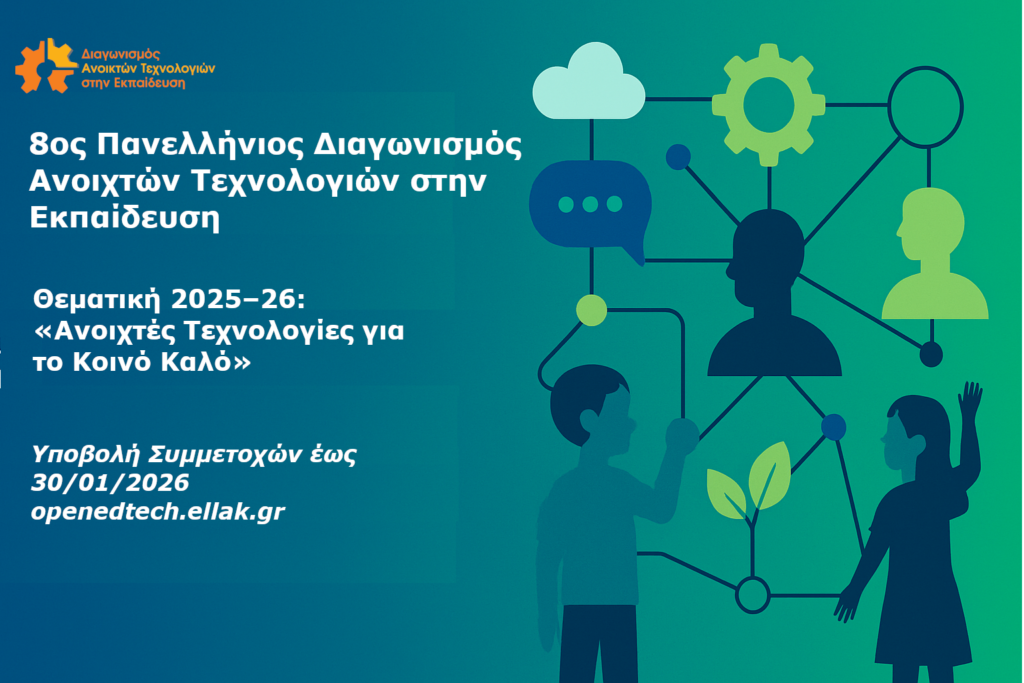 Η Οργανωτική επιτροπή του Διαγωνισμού Ανοιχτών Τεχνολογιών, ανακοινώνει την έναρξη του 8ου Πανελλήνιου Διαγωνισμού Ανοιχτών Τεχνολογιών στην Εκπαίδευση (https://openedtech.ellak.gr) και καλούν ομάδες μαθητριών, μαθητών και εκπαιδευτικών να δηλώσουν συμμετοχή έως τις 30/01/2026.