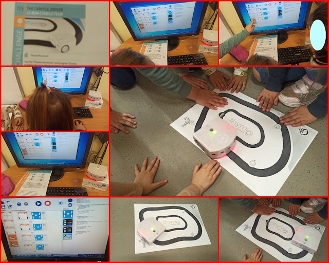 Ολοκληρώνοντας τις δράσεις μας για το ουράνιο τόξο ήρθε η ώρα να γνωρίσουμε το ρομπότ thymio, χρησιμοποιώντας μερικές από τις προτεινόμενες δράσεις των “challenge cards” χρησιμοποιώντας την εφαρμογή thymio suite-VPL. Συγκεκριμένα δοκιμάσαμε τη δράση ” THE CHAMELEON” και τη δράση “THE CAREFUL DRIVER”. Οι μικροί μας μαθητές είχαν την ευκαιρία να εξοικειωθούν με τη λειτουργία drag and drop και την επιφάνεια προγραμματισμού (VPL), να εξοικειωθούν με μερικές από τις λειτουργίες του thymio, να αντιληφθούν πως ο κώδικας μεταφράζεται σε συγκεκριμένες κινήσεις και συμπεριφορές του thymio (όταν διαλέγω αυτό το εικονίδιο τότε το thymio κάνει αυτό-API)